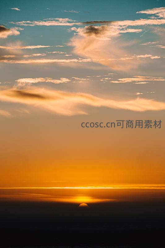 夕阳西下,金红色光芒洒满天际,云朵被染成暖色调,地平线处太阳半隐,营造出宁静而壮丽的自然画卷。