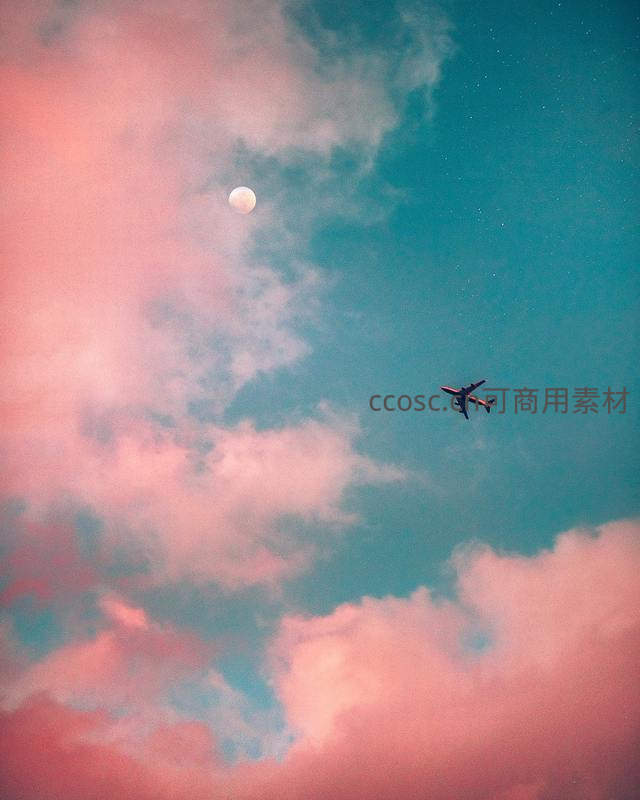 一架客机优雅飞越粉蓝交织的云海,一轮明月静静悬于天边,画面充满浪漫与遐想,仿佛载着旅人驶向未知的远方梦境。