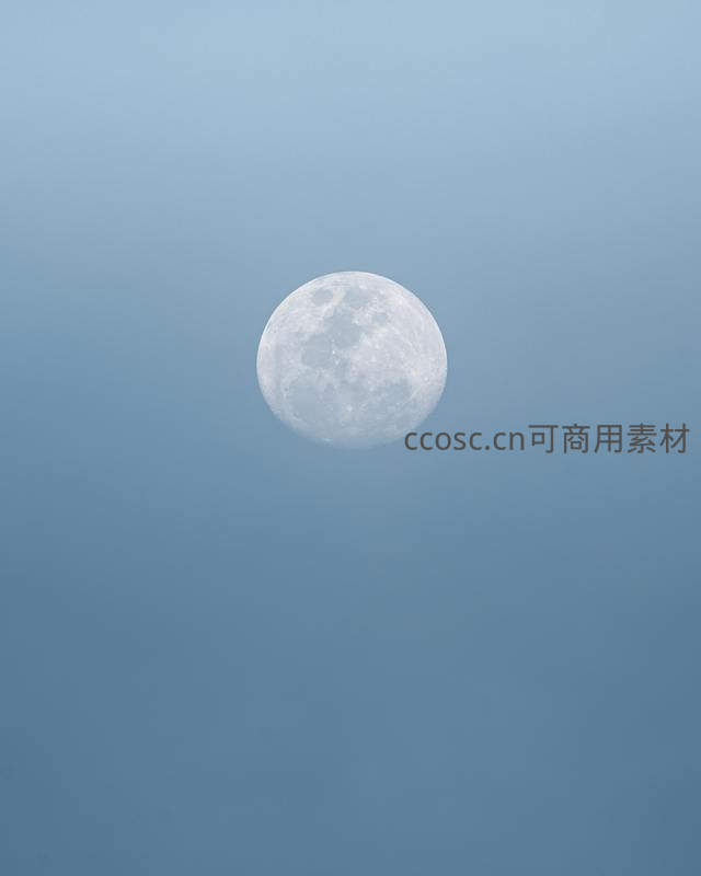 一轮圆满的明月静静高悬在纯净的蓝灰色天幕中,表面纹理清晰可见,营造出静谧、空灵且富有诗意的夜晚氛围。