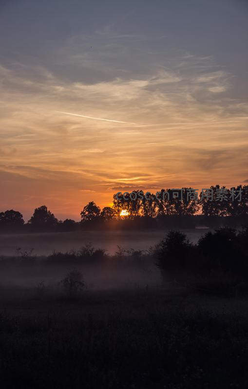 清晨薄雾笼罩田野与树林,太阳从树梢后缓缓升起,金色光芒穿透云层,将天空染成温暖的橙红色,营造出静谧祥和的氛围。