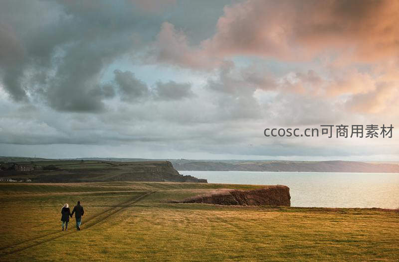 一对情侣手牵手漫步在辽阔的绿色草地上,远处是壮丽的海岸悬崖与平静的海面,头顶是被夕阳染成金粉的云层,画面充满宁静与浪漫。