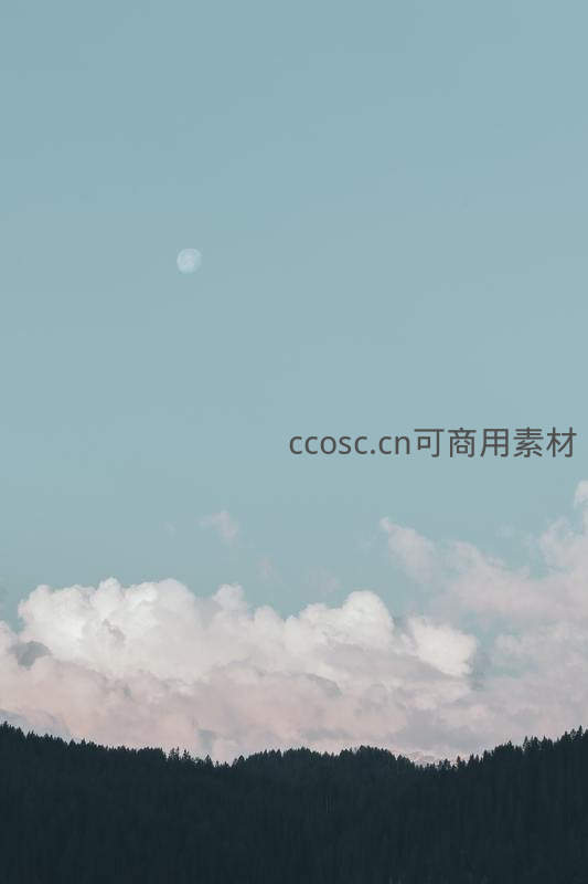 一轮明月高悬于淡蓝色天幕,下方是连绵起伏的深色森林剪影,蓬松的云层在山脊线上铺展,营造出空灵而宁静的自然氛围。