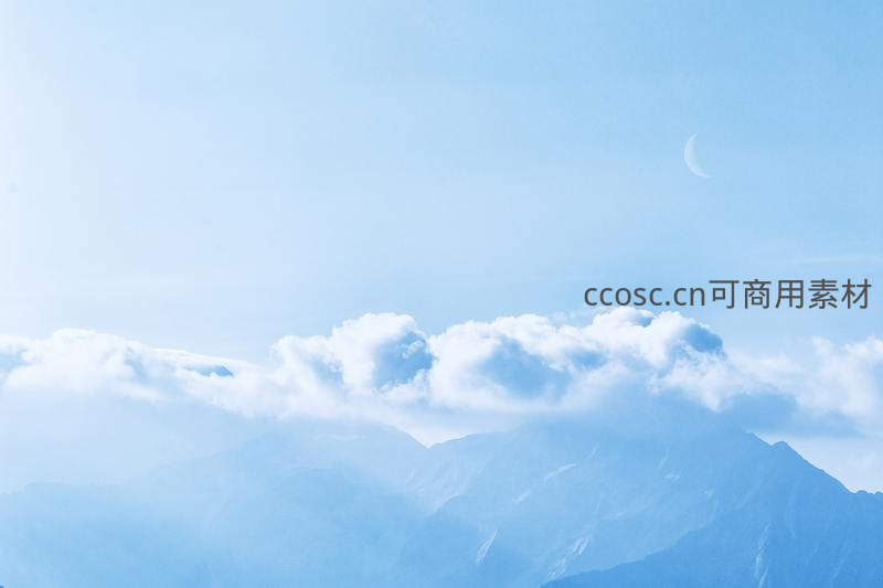 一弯纤细的新月悬挂于清澈的蓝天,下方是层层叠叠、被云雾温柔包裹的远山,整体色调清冷柔和,宛如一幅水墨山水画。