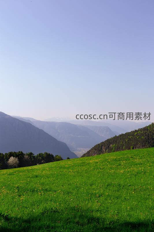 一片生机勃勃的绿色草甸铺满前景,点缀着星星点点的黄色小花,远处是层叠的青黛色山脉,在晴朗的蓝天下构成一幅宁静祥和的田园风光。