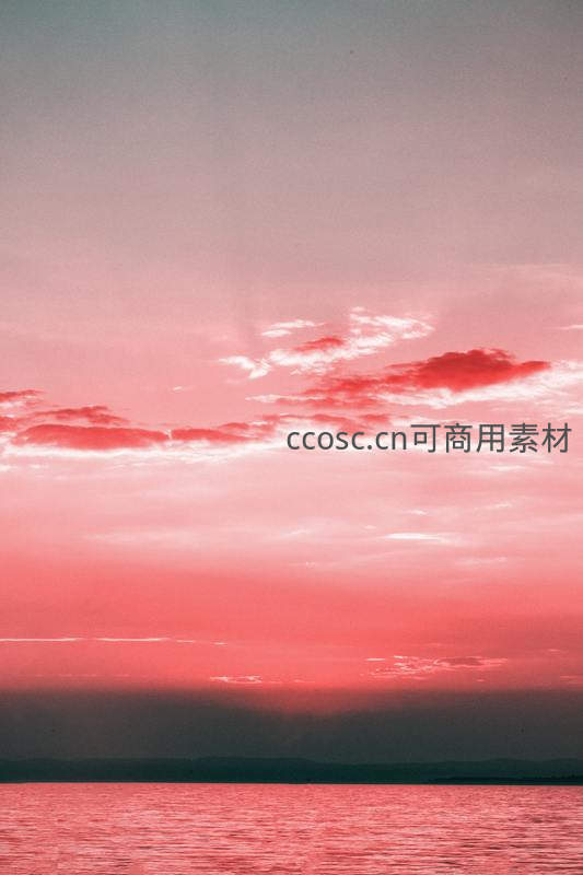 粉红霞光映照湖面,云层如画