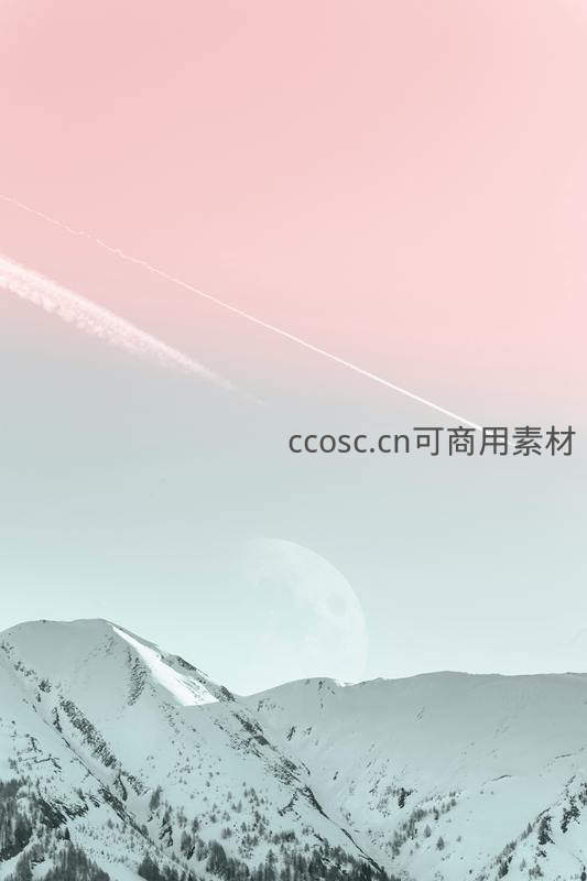 皑皑雪山静卧于天地之间,一轮明月高悬淡青色的天空,飞机划过的白色航迹横贯天幕,构成一幅冷冽而诗意的冬日奇景,充满超现实美感。