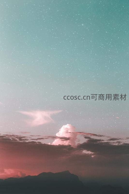 深邃夜空点缀繁星,远山轮廓隐约可见,中央一朵粉云如灯塔般照亮天际,营造神秘而宁静的宇宙氛围。