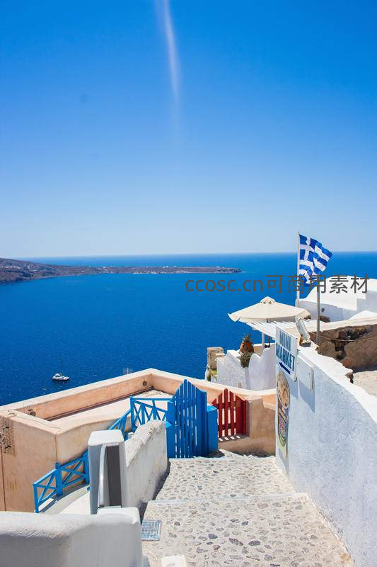 阳光明媚的圣托里尼,白色建筑与蓝色门窗点缀在悬崖之上,远眺湛蓝爱琴海,希腊国旗迎风飘扬,尽显地中海风情。