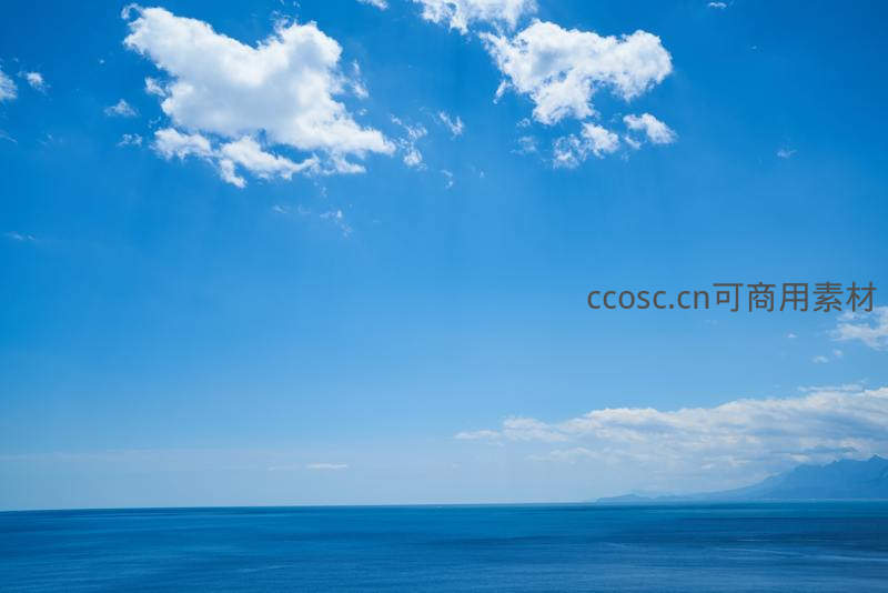 平静的海面与辽阔的天空在远方融为一体,几朵白云悠然飘浮,远处山峦若隐若现,营造出一种空旷、宁静、令人心旷神怡的意境。