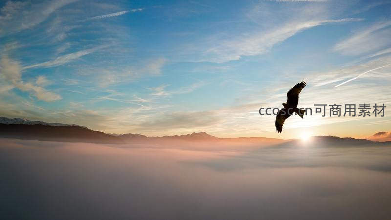 一只雄鹰在晨曦中展翅翱翔,背景是金色的日出与翻腾的云海,远处山脉轮廓隐约可见,画面充满自由与力量感,象征着希望与高远。