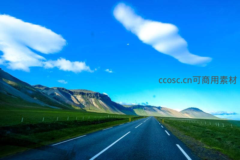 一条笔直的柏油路穿越广袤绿野,两侧是连绵起伏的山丘,头顶是清澈蓝天和几朵悠闲白云,传递出旅途的自由与探索未知的向往。