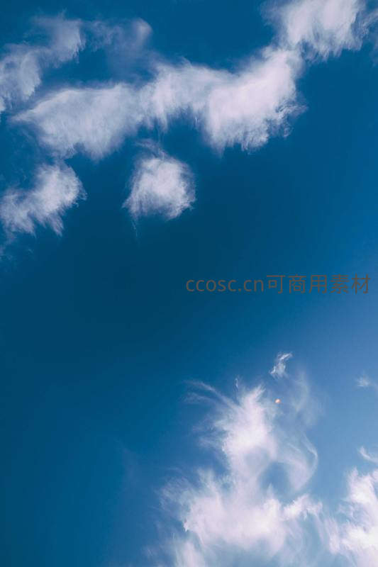 深邃的蔚蓝天空为画布,几缕轻盈洁白的云朵悠然飘浮,形态各异如絮如纱,营造出空灵、静谧且令人心旷神怡的视觉享受。