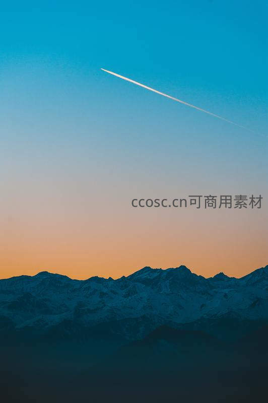 在渐变的暮色天空下,雪峰巍峨耸立,一道清晰的飞机航迹横贯天际,将现代文明的印记融入原始壮丽的自然画卷之中。