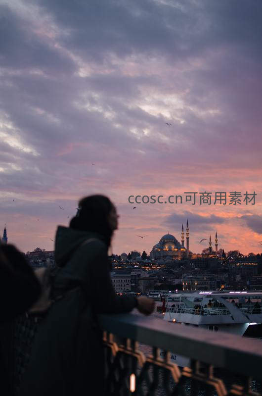 一位游客在桥上凝望远方,背景是被晚霞染红的天空和灯火初上的历史古迹,充满了异域风情与静谧的诗意。