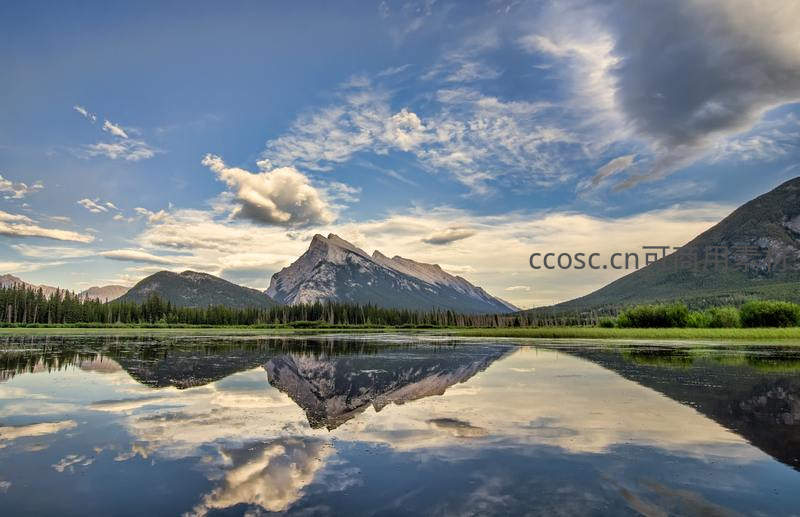 平静湖面完美倒映巍峨山峰与蓝天白云,绿树环绕,构成一幅宁静和谐的自然画卷,令人心旷神怡。