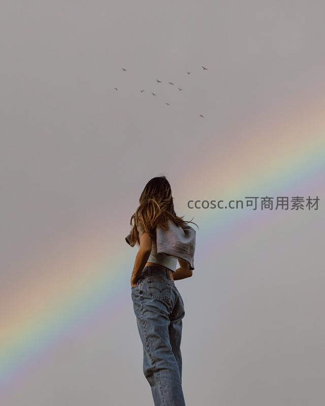 女子背对镜头伫立,凝望横跨天际的彩虹与翱翔的飞鸟,画面充满诗意与宁静,传递着自然的美好与希望。