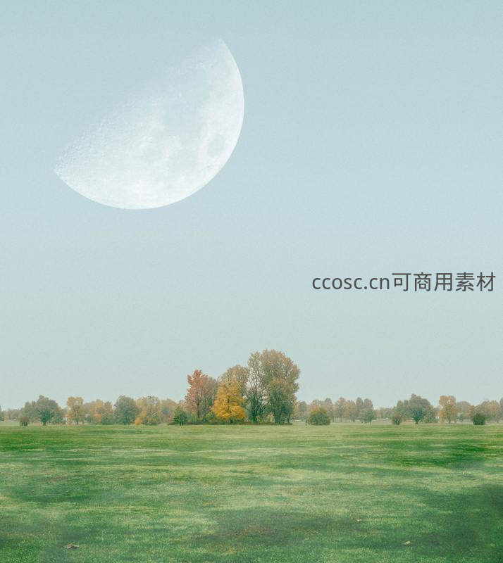 一轮巨大的月牙低悬在清澈的天空中,俯瞰着广袤的绿色草原。远方的树林染上了秋天的金黄与橙红,整个画面营造出一种梦幻、宁静而超现实的氛围。