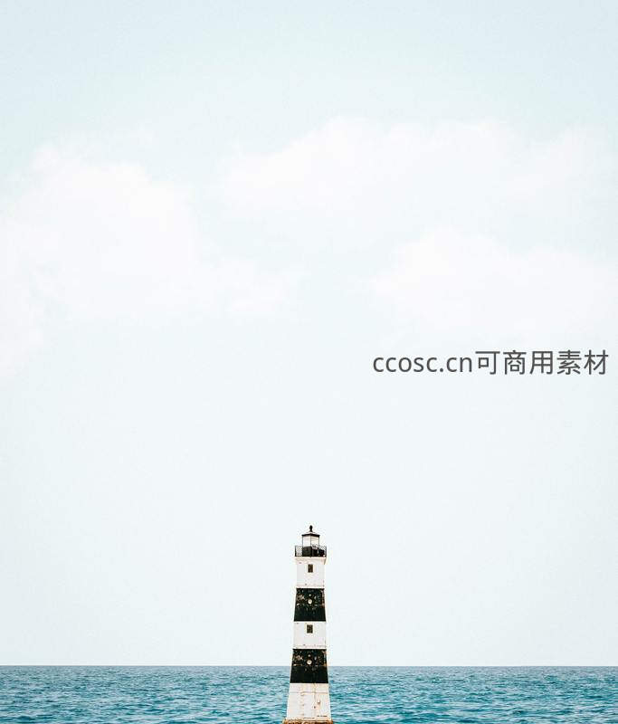 一座经典的黑白条纹灯塔独自伫立在平静的海面上,背景是广阔无垠的浅蓝色天空和几缕薄云。画面极简而富有诗意,象征着指引、守护与永恒的宁静。
