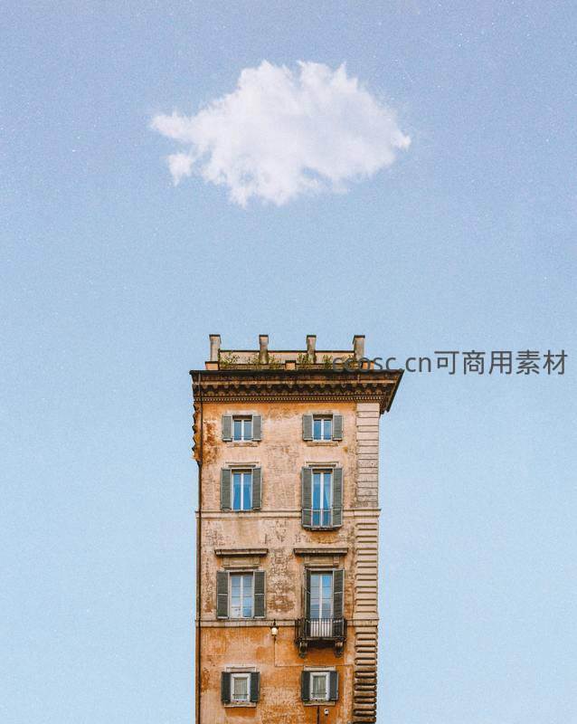 一栋充满历史感的欧式老建筑拔地而起,其顶部仿佛托举着一朵轻盈的白云。蓝天为幕,建筑的斑驳墙面与整齐窗框形成对比,充满了超现实的艺术美感。