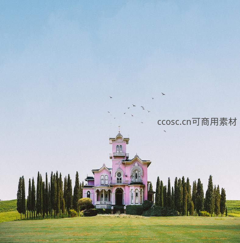 一座梦幻般的粉色维多利亚式古堡,坐落在青翠的山丘上,周围环绕着高耸的柏树,天空中飞鸟掠过,景色如画。