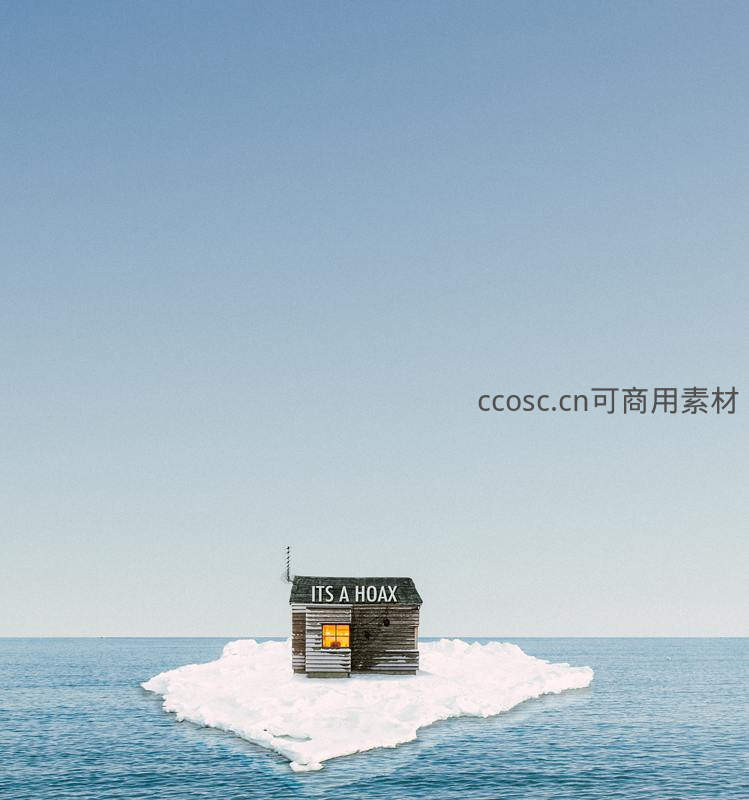 一座写着“IT'S A HOAX”的小木屋孤独地漂浮在海面浮冰上,温暖的灯光从窗户透出,与空旷的蓝色大海和天空形成强烈对比。