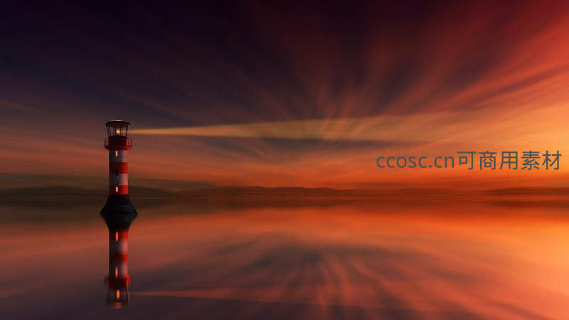 一座红白相间的灯塔伫立在平静的水面上,其清晰的倒影与绚烂的橙红色晚霞交相辉映,营造出静谧而壮丽的氛围。