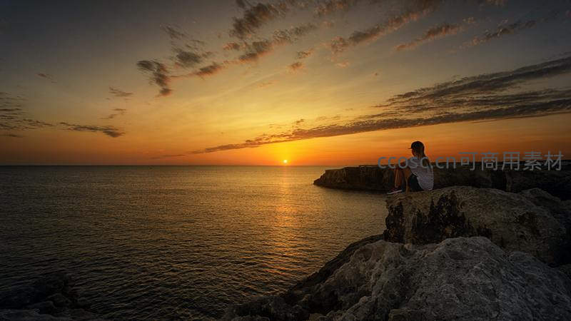 一位女子独自坐在海边悬崖上,凝视着金色夕阳沉入海平面,天空被染成橙红与深蓝交织的画卷,海面波光粼粼,氛围宁静而略带忧郁。