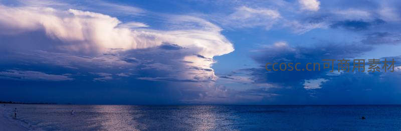 厚重的风暴云层低垂于海平线上,天空呈现深邃蓝调,海面平静如镜,远处隐约可见人影,整体氛围神秘而宁静,充满自然力量。