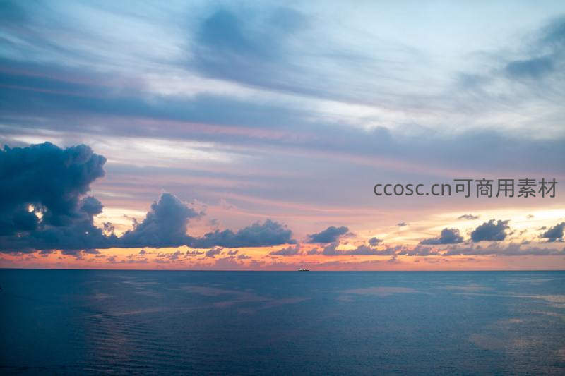 壮丽的晚霞染红了天际,与深蓝的海洋融为一体,远处孤舟点缀,构成一幅宁静而宏大的自然画卷。