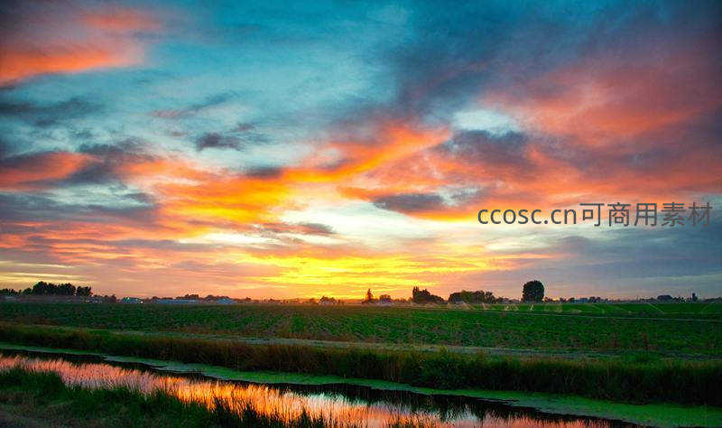 广阔的田野在绚丽的日落余晖下显得格外宁静,水渠中清晰倒映着燃烧般的云彩,宛如一幅色彩浓烈的田园油画。
