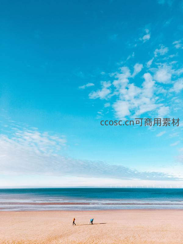 在无垠的金色沙滩上,两人悠然漫步,远处是深邃的蔚蓝大海与纯净天空,构成一幅宁静而治愈的海滨画卷。