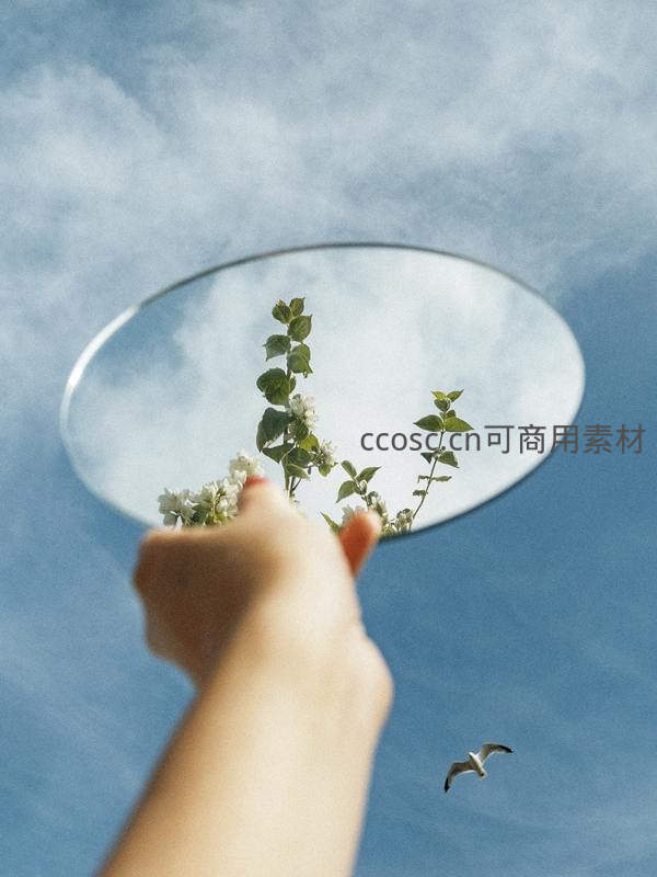 一只手举着圆形镜子,镜中倒映着绿叶白花,镜外是湛蓝天空与飞过的海鸥,虚实结合,充满诗意与想象力。
