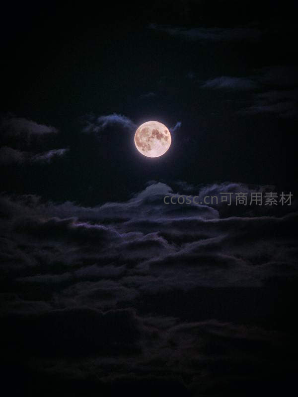 一轮明亮的满月悬挂在深邃的夜空中,周围漂浮着幽暗的云层,营造出一种静谧、神秘而又浪漫的夜晚氛围。