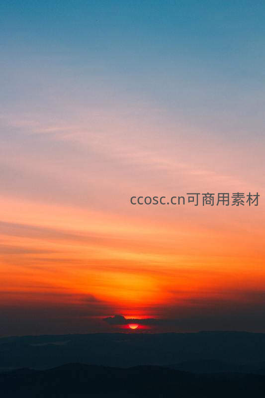 橙红色的夕阳缓缓沉入远山背后,天空被染成渐变的粉紫与金红,云层如绸缎般铺展,山峦剪影勾勒出大地的宁静边界,尽显黄昏壮美。
