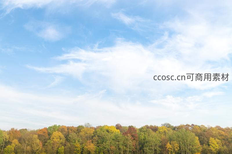金秋时节,五彩斑斓的树林铺满地平线,上方是飘着丝缕白云的澄澈蓝天,构成一幅宁静而壮丽的季节性自然风光画卷。