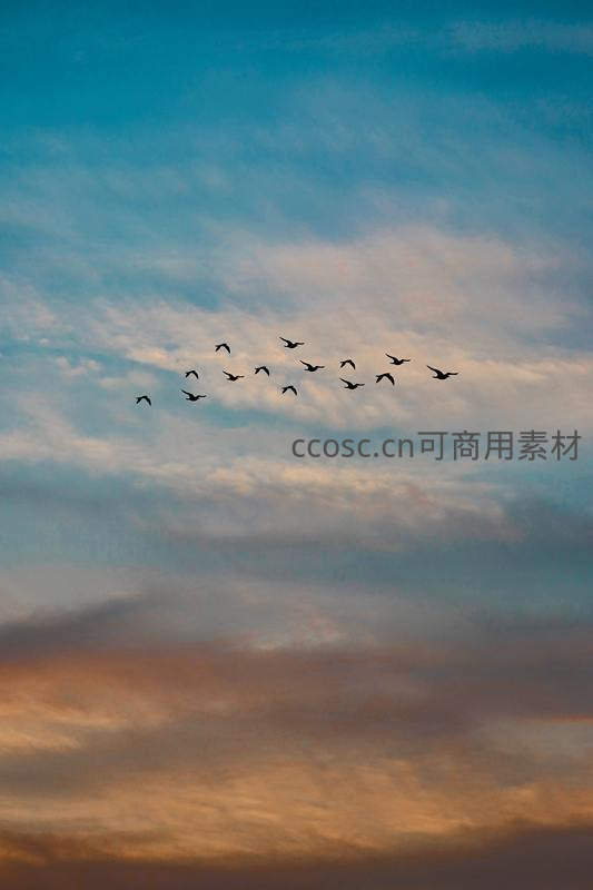 一群大雁在绚丽的晚霞中排成队形飞翔,云层被染成温暖的橙色与蓝色,构成一幅宁静而壮美的自然画卷。