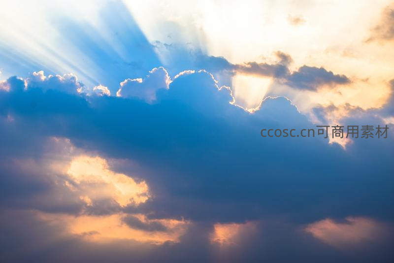 太阳从厚重云层后射出耀眼光芒,形成耶稣光般的视觉奇观,蓝白交织的云朵衬托出大自然的恢弘与神秘。