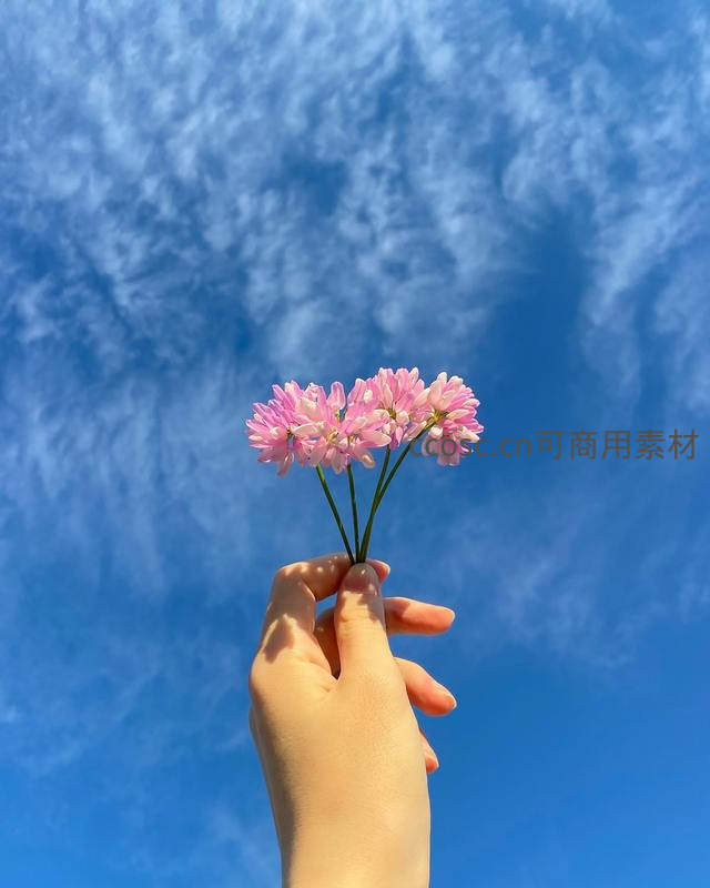 手掌温柔托起几支盛开的粉色小花,以广阔的湛蓝天空为背景,构图简洁而富有生命力,传递宁静与美好。