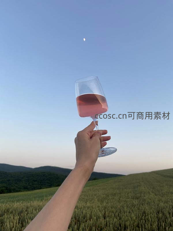 在起伏的绿色麦田上,一只手高举盛有粉红葡萄酒的高脚杯,远方山峦与天边弯月相映,氛围静谧而浪漫。