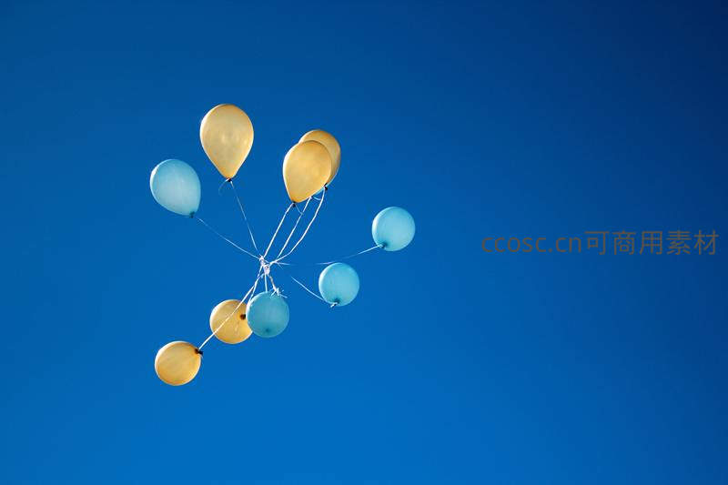 一簇黄蓝相间的气球系在一起,飘浮于纯净深邃的蓝色天空中,象征着欢庆、童真与对未来的无限憧憬。