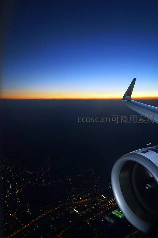 从万米高空俯瞰,飞机机翼划破暮色,地平线处橙黄与深蓝交融,下方城市灯火如星河般闪烁,展现旅途中的壮丽瞬间。