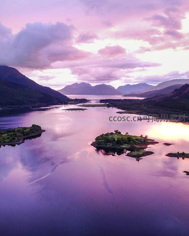 高空俯瞰下,紫色霞光洒满宁静的湖面,远山如黛,小岛点缀其间,云影与水波交织,构成一幅梦幻般的自然画卷。