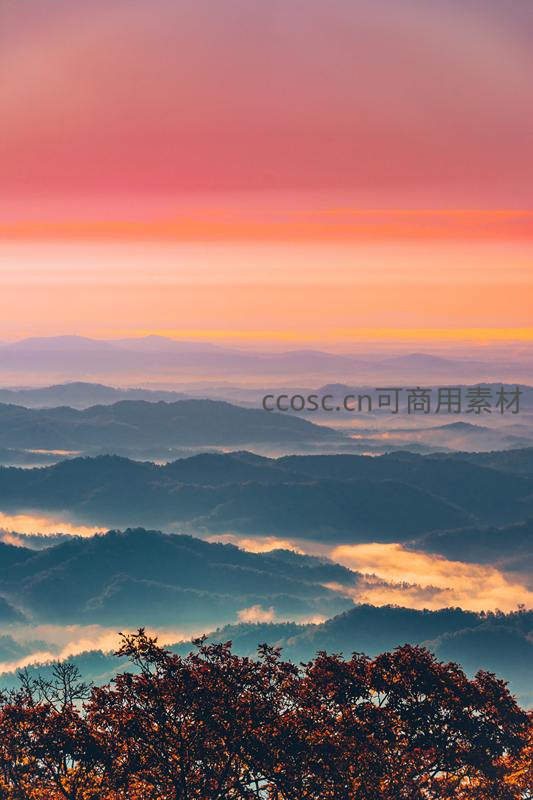 清晨的群山被流动的云海温柔包裹,朝霞染红天际,远山如黛,近处树冠在暖光中泛着金边,宛如一幅梦幻山水画卷。