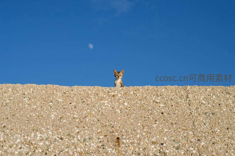 一只毛茸茸的小猫从粗糙的墙顶探出脑袋,睁大眼睛好奇地张望,背景是纯净无云的蔚蓝天空和一轮明月。