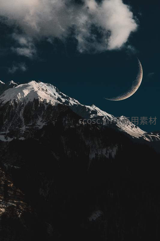 巍峨的雪山在深蓝夜幕下静默矗立,一弯新月悬于云层之间,营造出一种壮丽而神秘的自然氛围。