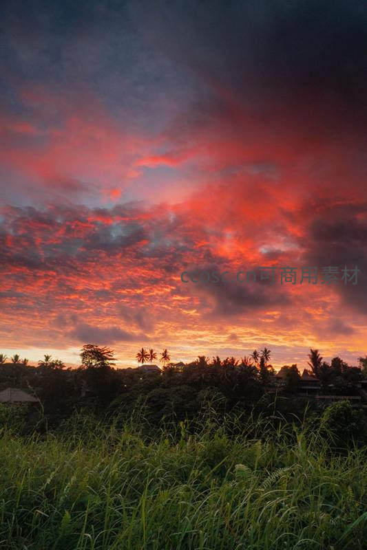 清晨时分,天空被烈焰般的红云覆盖,地平线处隐约可见村落与椰林,前景青草摇曳,构成一幅充满生机与希望的田园画卷。