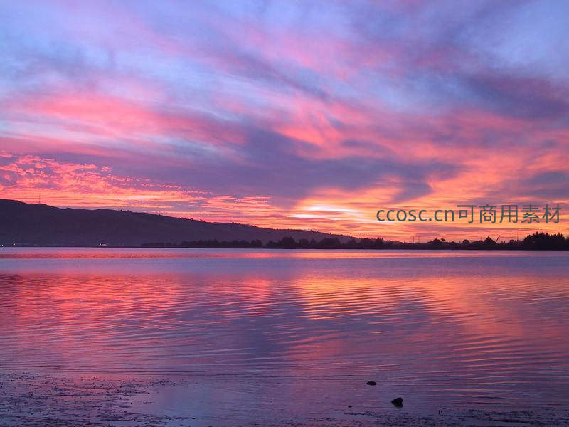 湖面倒映绚烂晚霞,山峦剪影静谧如画