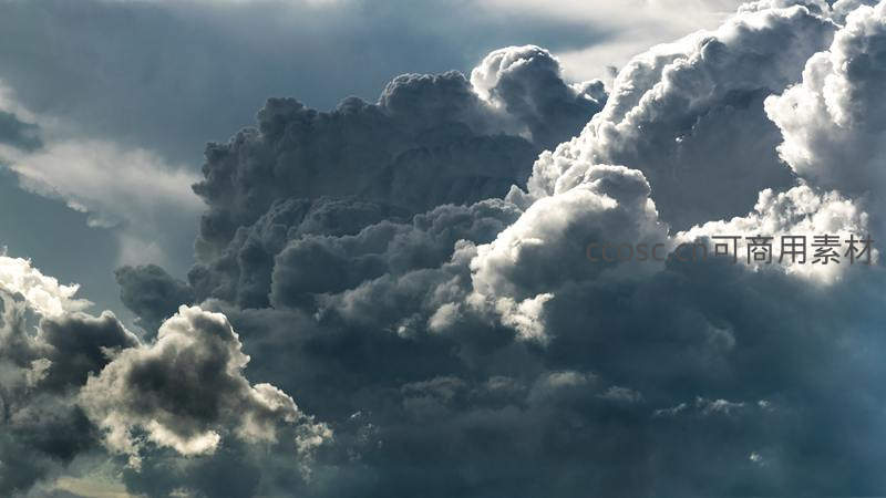 厚重的积雨云层在天空中剧烈翻滚,深灰与亮白交织,透出强烈的光影对比,预示着一场猛烈风暴即将降临,展现出大自然原始而震撼的力量感。