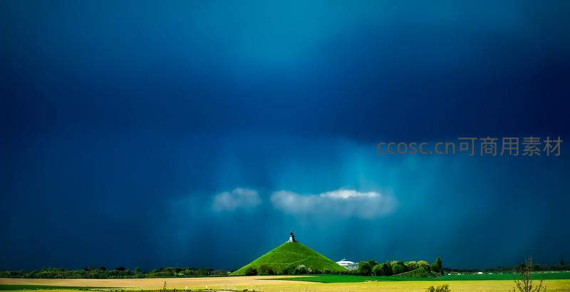 在深邃的蓝色风暴云下,一座翠绿的小山丘孤零零地矗立着,山顶上一个渺小的身影仿佛在静候风雨的到来,构成一幅壮丽而宁静的自然画卷。