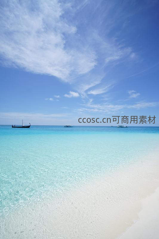 细软的白沙延伸至清澈见底的碧蓝海水,几艘小船悠然停泊在远处的海平线上,天空湛蓝,白云飘逸,整个画面充满了宁静、悠闲与无尽的夏日气息。